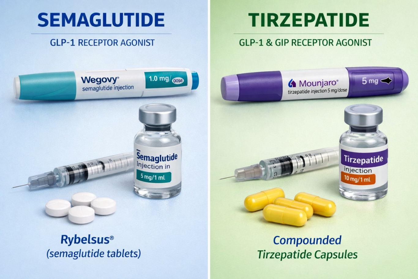 🟥 Tirzepatide is a newer, dual-hormone (GLP-1 + GIP) agonist that generally produces greater weight loss and glycemic control on average.